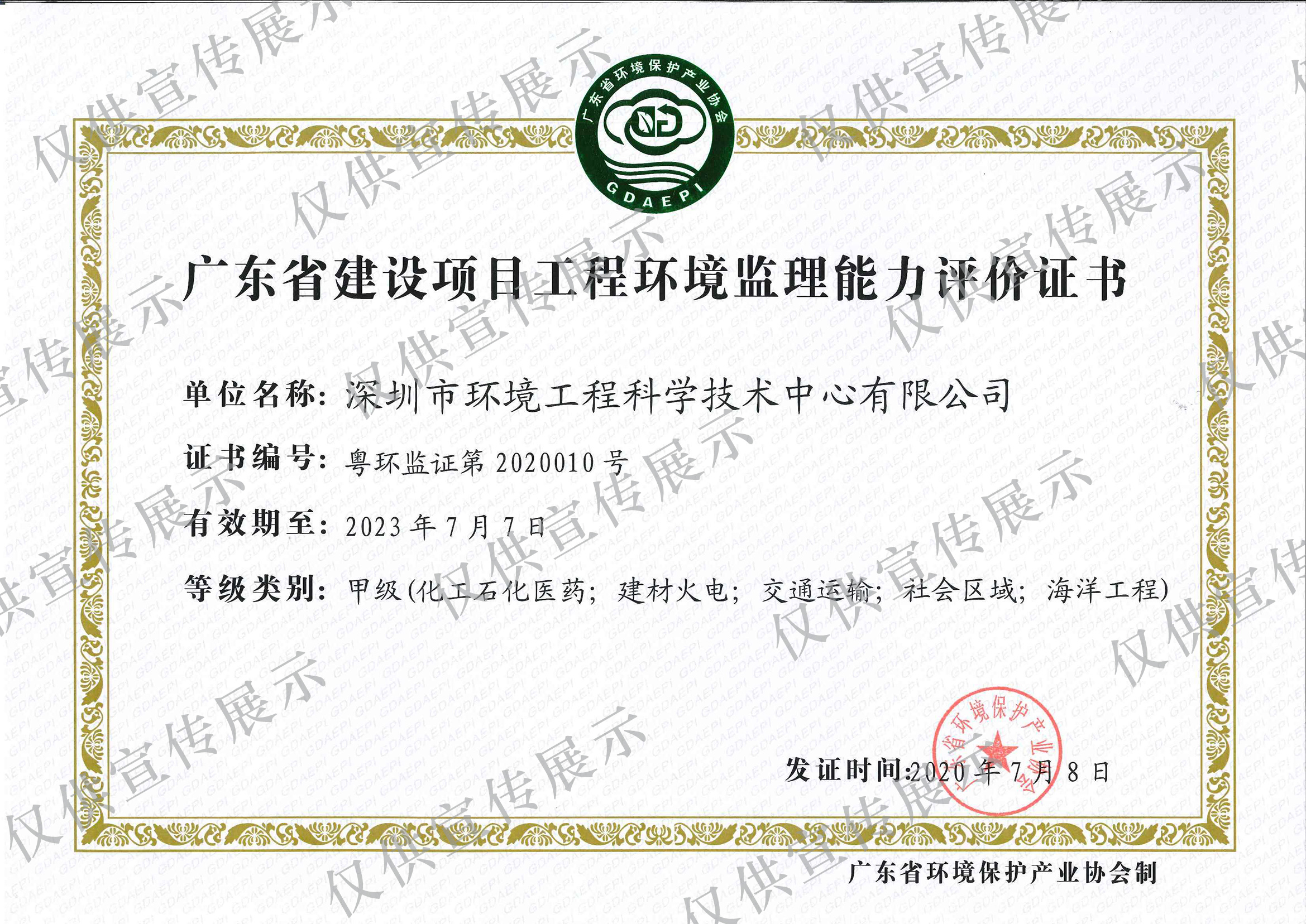 • 廣東省建設(shè)項(xiàng)目工程環(huán)境監(jiān)理能力評(píng)價(jià)證書